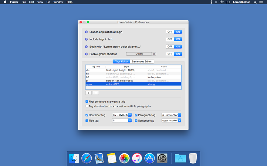 With a single click, LoremBuilder allows you to effortlessly copy the desired amount of random text to fill empty layouts, documents and visual presentations. Advanced functions include customizable filler text with fully personalized tags and the possibility to recall formerly selected text in your pasteboard by simply using a personalized key combination.